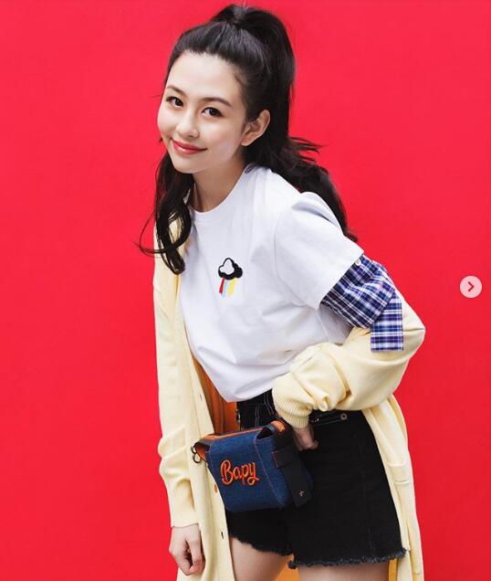 沉月最新发布的照片中,以简单的印花T恤配搭牛仔外套,活力十足,方巾装饰的丸子头及白色手袋为造型加入少女味。