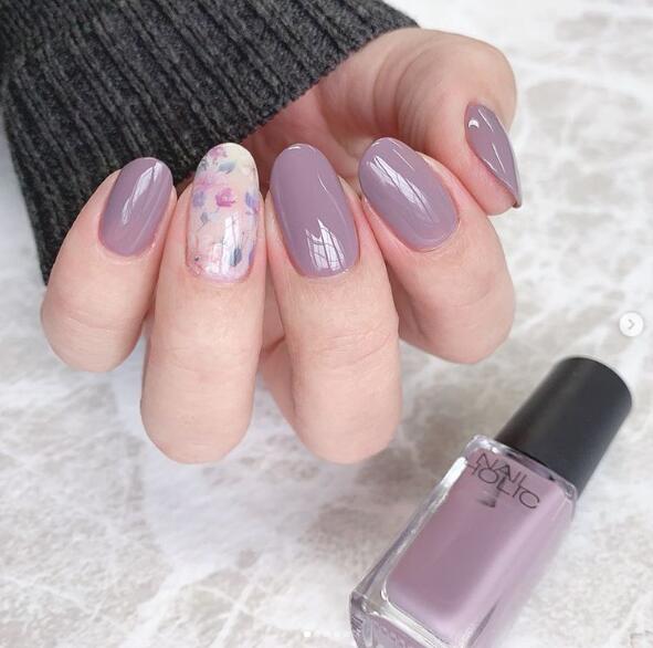 温柔小姊姊必备款是它!在饱满的柔紫色美甲之间,穿插上单指的花卉设计,画龙点睛的小巧思让手指充满亮点,流露出有点娇羞的小温柔!