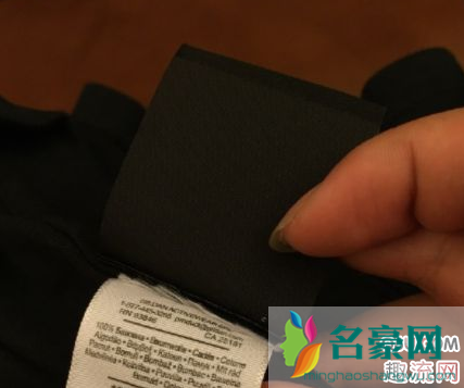首先我们看领标。领标很明显的是补在捆条上面的。捆条是衣领跟大身结合的部位。第一是可以压住车缝位,第二是能够有效的减少领口变形。品牌标都是一次性成型,车在捆条下面的。