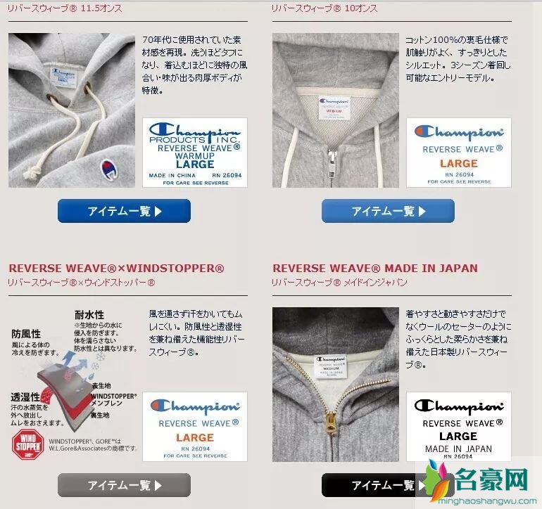 Reverse Weave®=横向编织技术!由Samuel N. Friedland为Champion发明的永恒经典,被称为运动衫的先驱,亦是产品线中价格最为昂贵的系列。其技术原理是为减轻垂直方向上的缩水问题,因此将织物横向编织移动,可极大程度加强衣服的耐用性。同时衣领下方、袖口、下摆以及两侧都是螺纹设定,保证穿着舒适的同时也有固定廓形和防止运动后的热量散失的作用。