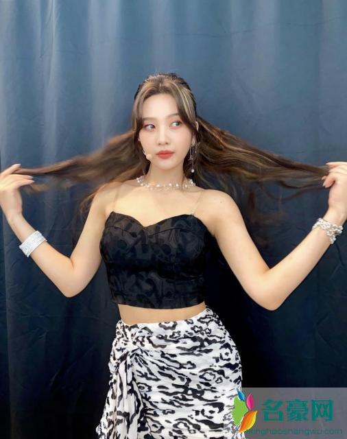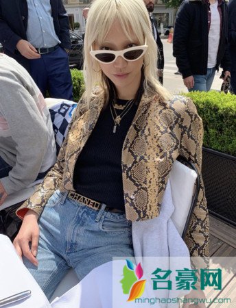 ▲泫雅上半身穿皮革外套,下身为斑马纹长裙,开衩设计露出长腿,混搭球鞋穿出街头感。