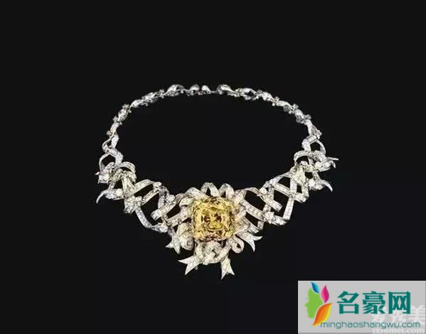 电影《蒂芙尼早餐》中,便于搭建女一号霍莉内心对上流社会的迷恋美梦又或是投影她对非常甜蜜的爱的期待,让·史隆伯杰应用幽美的绸带元素为其方案设计了几种底座,最终,它与上千颗环状美钻置入于“RibbonRosette”绸带颈链上。
