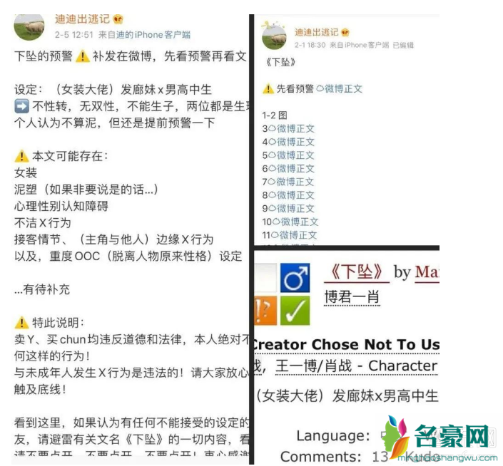 导火索一位叫做“迪迪出逃记”的博主在自己的微博上PO了一篇以肖战和王一博为原型作为创作的同人文,还贴上了AO3和lofter(外号老福特,是国内现在最火的同人创作网站)的文章阅读链接。