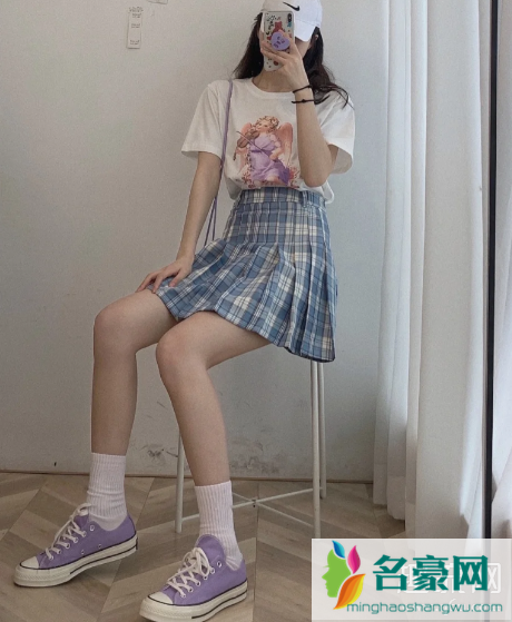 天使T恤+百褶裙,粉紫色搭配,学生党也可以这样穿