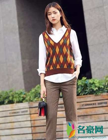 白色衬衫是比较好搭配的衣服,直接穿、打底穿都很大方,搭配一件针织背心,很有学院范儿。