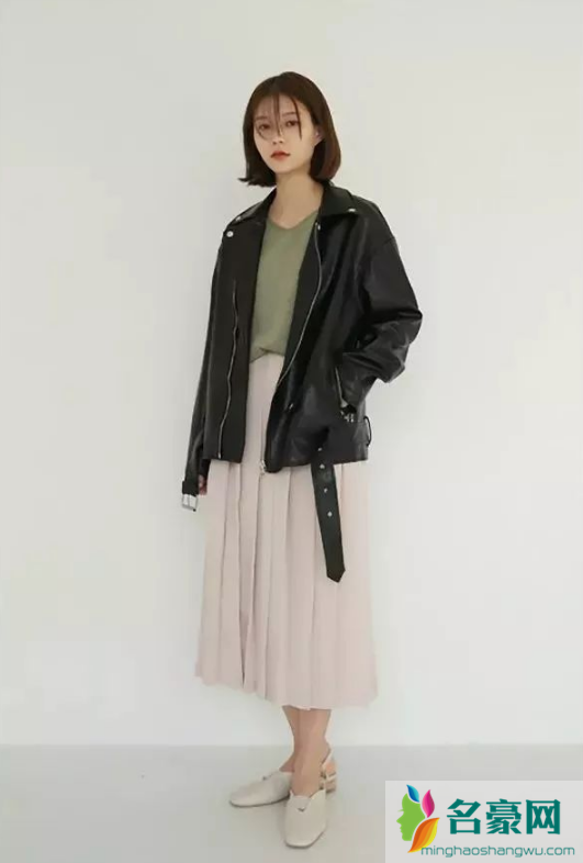 皮夹克+草绿色打底衫+浅色百褶裙+白色单鞋
