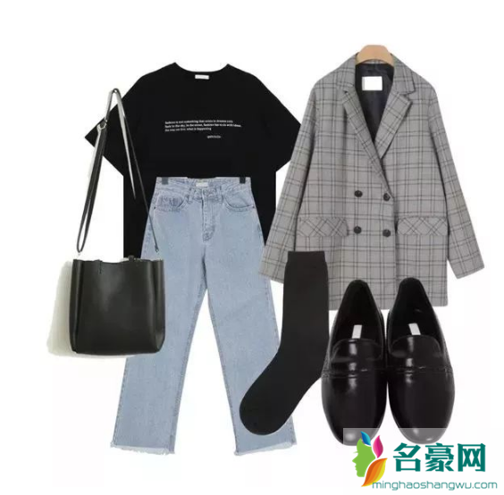 格纹西装+黑T+直筒牛仔裤+中筒袜+乐福鞋