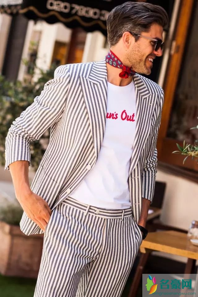 如果你的西装有花纹或者条格纹元素的话,T恤尽量保持素雅,否则内搭的T恤也同样充满图案元素的话,则会给人眼花缭乱的感觉。