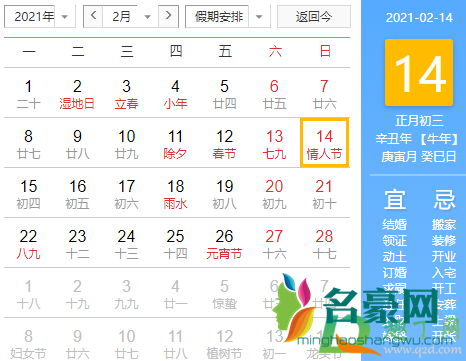2021年2月14日是西方的传统情人节,很有纪念意义,所以很多情侣会选择这天结婚。从择吉的角度看,这一天在老黄历上是适宜领证结婚的。而且这个时候正刚过春节,年味正浓,可以说是双重喜事,并且可以收到很多亲朋好友的祝福。