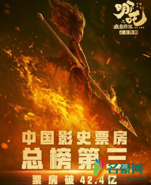 8月21日,据灯塔专业版数据显示,国产动画电影《哪吒之魔童降世》票房达到42.39亿元,超越《复仇者联盟4:终局之战》跻身内地总票房榜第三名。仅次于《战狼2》(56.8亿)、《流浪地球》(46.5亿)。