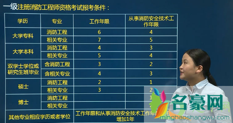 1.具有消防工程专业学历,工作6年,其中消防技术工作4年;或具有消防工程相关专业的大学学历,工作7年,其中5年从事消防安全技术工作。