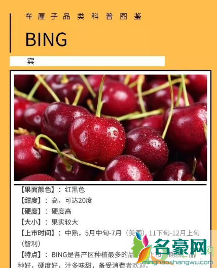 俗称“冰种”,该品种产地多,产量大,而且空运海运皆可。果面颜色棕红,果型偏圆,个头大而果核小,口感好,酸甜比例适中。bing的优点是硬度极好,货架期较长,因此bing也成为市场上较为热销的品种之一。
