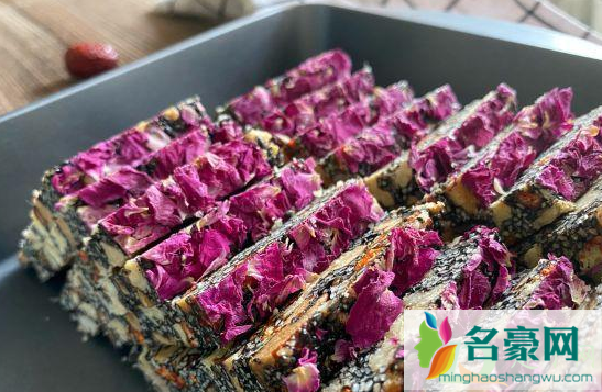 5.将剩余的玫瑰花瓣均匀撒在模具的底部,然后倒入混合的成分,压实,冷却并切成小块。
