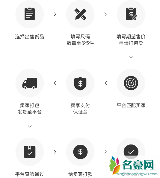 大家可以看一下交易的流程,首先是选择出售的商品,之后是选择尺码,数量至少五件,其次就是预计出售的价格,平台同意之后打包发货,这个时候需要支付一定的保证金,最后就是平台匹配到买家之后就打钱,这个过程看着是不是很简单,对于小贩子们来说这个打包卖的形式还是很不错的。
