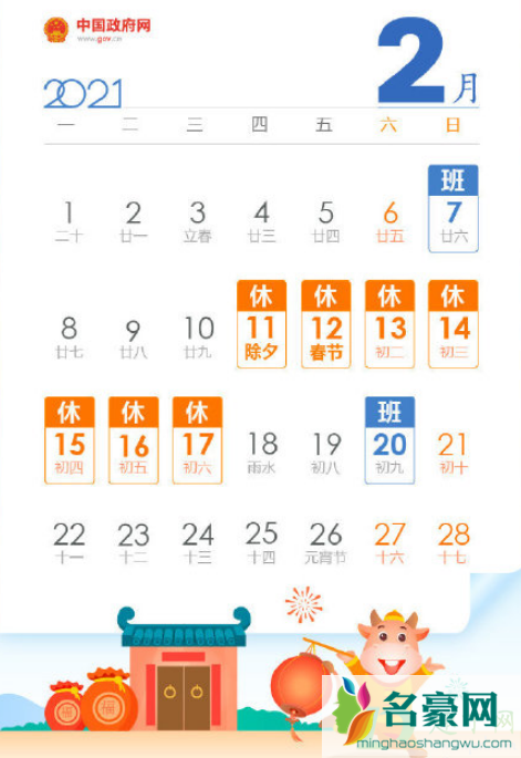 二、春节:2月11日至17日放假调休,共7天。2月7日(星期日)、2月20日(星期六)上班。