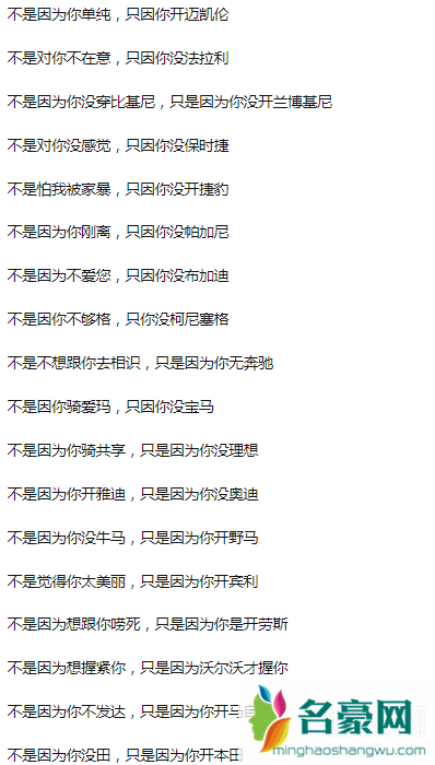 这句话是出自近日汽车圈非常火的一句顺口溜,“不是对你没感觉,是你没开保时捷。”即有人爱你是因为你开豪车保时捷,即只要你有钱,就会有人“爱”你的钱。虽然是调侃的顺口溜,不过也颇据讽刺意义,这样的黑色幽默和顺口程度使得这句话近日在网上传开。而网友们的再创作也是无敌了!