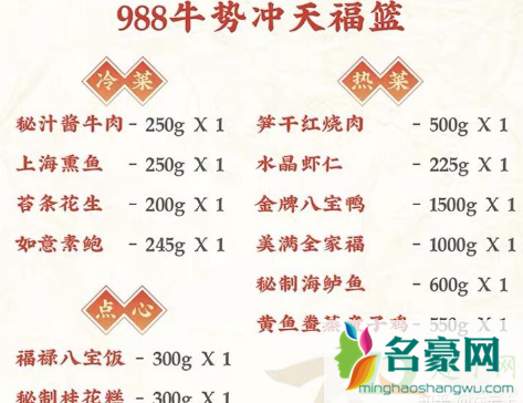 上海老饭店的老字号品牌,有本帮菜传统烹饪记忆非物质文化遗产的称号,今年他家推出的四冷六热二点心的半成品套餐几乎涵盖了海派年夜饭的标配,熏鱼,八宝鸭,全家福,红烧肉,八宝饭,都是不可错过的年夜饭经典菜肴。共有688,988,1288三个套餐可选,6-12个菜不等。