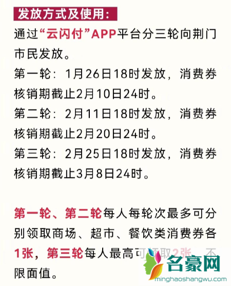 2022年荆门云闪付消费券活动时间是2022年1月26日至4月30日。一共分3轮发放,大家在活动页面领取即可。具体时间安排:第一轮 1月26日18时,使用期限截止2月10日24时;第二轮 2月11日18时,使用期限截止2月20日24时;第三轮 2月25日18时,使用期限截止3月8日24时。
