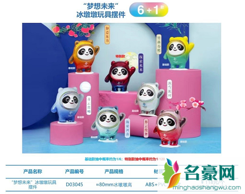 与其他普通盲盒类似,冰墩墩盲盒也有一个隐藏的型号和六个普通型号。冰墩墩盲盒由多种颜色组成,包括红色、橙色、灰色、蓝色和绿色。蓝色渐变色。黄色、绿色和红色和蓝色渐变色。冰墩墩的盲盒设计与冰墩墩的形象相同。它们由冰晶外壳和熊猫形象组成。