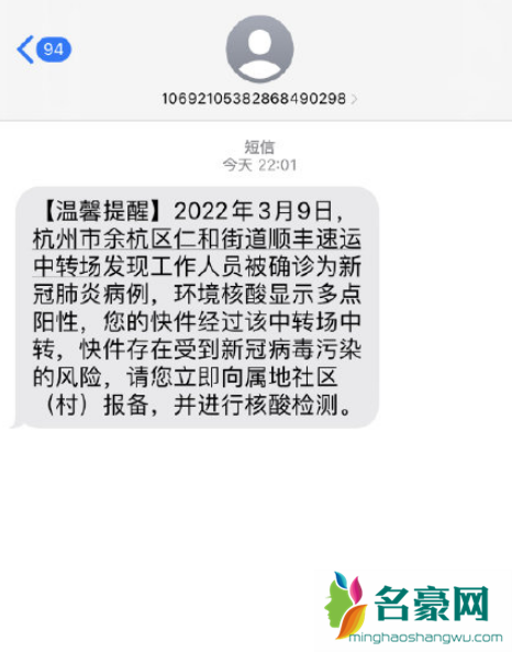 2022年3月9日,杭州市余杭区仁和街道顺丰速运中转场发现工作人员被确诊为新冠肺炎病例,环境核酸显示有多点阳性,您的快件经过该中转场中转,快件存在受到新冠病毒污染的风险,请您立即向属地社区(村)报备,并进行核酸检测。记者第一时间咨询了余杭区政府,得到回复是:这类短信是杭州市新冠病毒肺炎疫情防控指挥部发出的,如果您对快递有接触,请前往所在社区(村)进行核酸检测。