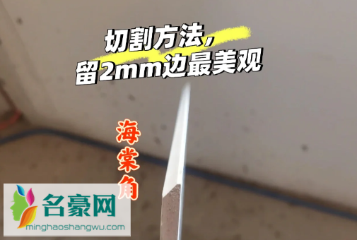 将瓷砖切割成45度 但不切割到头,底部预留2mm(增加收口面,美缝收口减少崩瓷)。海棠角比较考验师傅手艺(要切割平整预留一致),如果师傅没有把握可让瓷砖场加工,建议还是找个好点的师傅放心。优缺点是美观大方,但有些地方因费工需要加钱(个人觉得多不了多少,住一辈子呢)