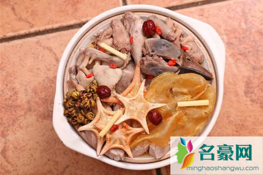 2、海星三宝(双人汤)材料:海星10g、扇贝3只、牛蛙200g、鲍鱼300g、龙眼肉适量、瘦肉500g、黄酒适量、生姜适量、盐适量。