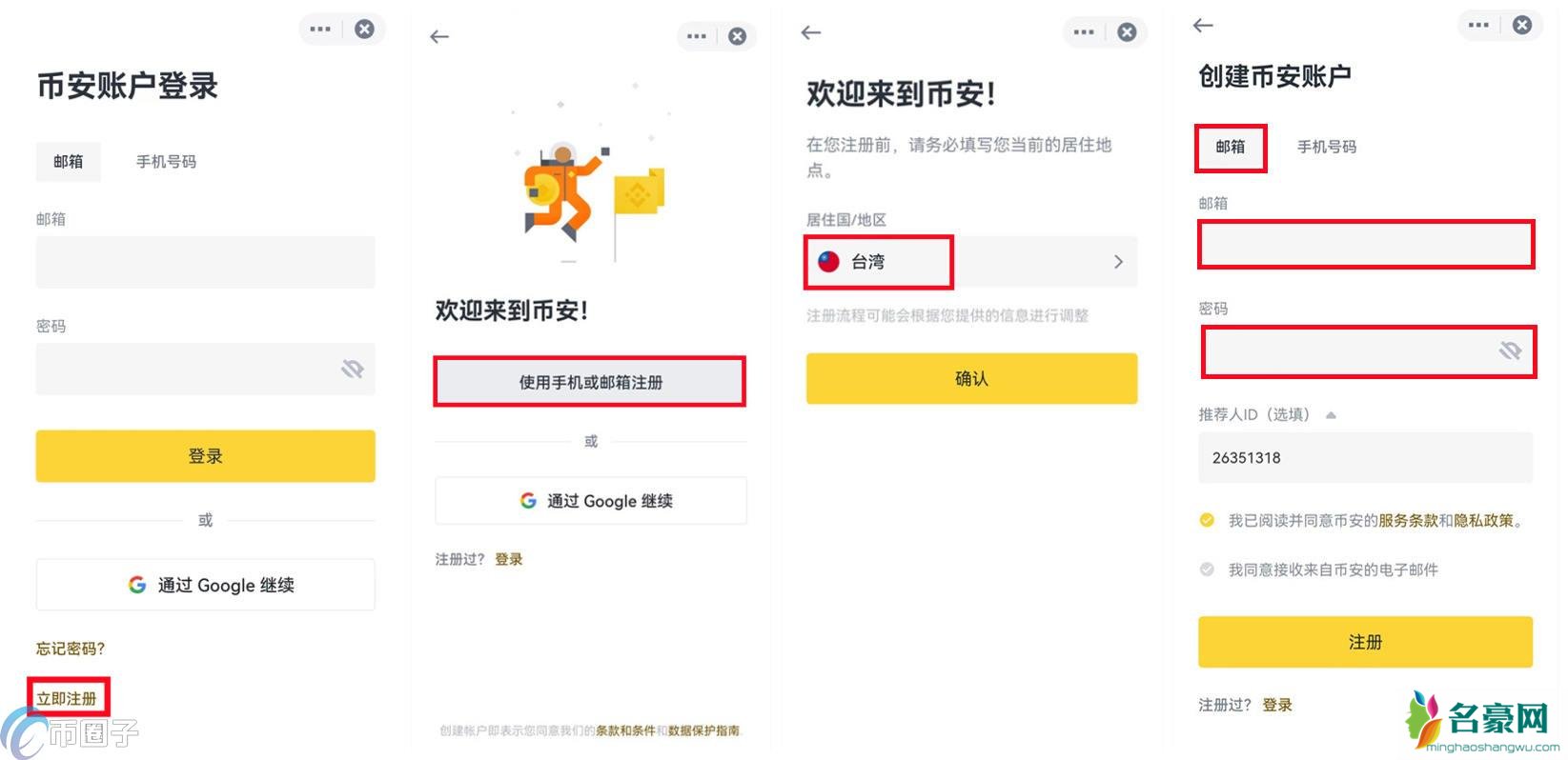 2.点击后跳转至登录/注册页面。如您还未注册,根据下方提示选择【立即注册】--【使用手机或邮箱注册】--居住国/地区选择【台湾】,按照要求输入邮箱和密码。仔细阅读过《币安服务条款》后勾选并点击【注册】按钮。