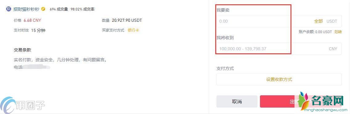 5. 点击出售USDT之后会出现弹窗,根据弹窗提示操作输入卖出USDT数量,点击【出售USDT】,等待买家放款即可。