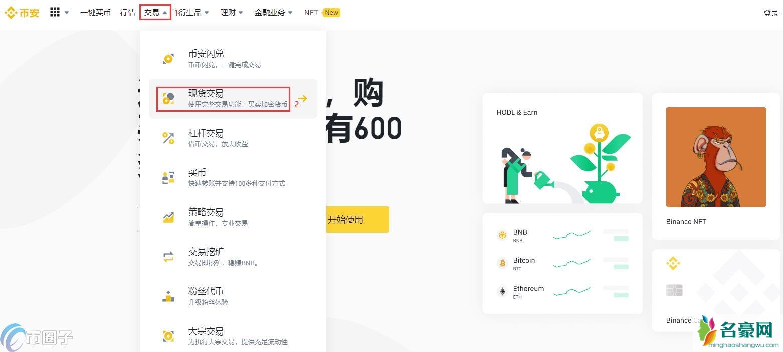 1.登录币安官网,如果你还没有账号可以点此注册新账号,根据提示点击【交易】--【现货交易】进入交易页面
