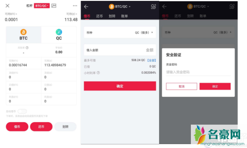 2. 点击“借币”,在借币页面中选择借币币种,输入借入金额并点击“确定”,输入资金密码。点击“确定”,即操作成功。