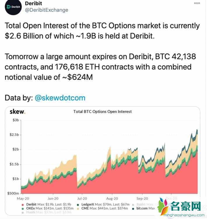 比特币期权市场的未平仓量总额为26亿美元,大约19亿美元在Deribit平台上。10月30日,Deribit上将有一大批期权到期,其中包括42138份比特币合约和176618份以太坊合约,名义价值总计约为6.24亿美元。