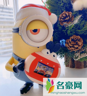 这个也是带着圣诞帽的小黄人,它是单眼造型的,整个是一个站立的姿势。胸前拿着一个照相机,上面的图片是可以滑动转换的,后面有一个卡扣,是可以打开的,然后里面是可以存放东西的。