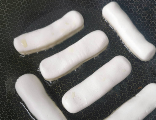 准备好干糍粑,切成大小相同的小方块。锅中倒入半锅油,用大火加热。油温60%热时,转小火,然后一块块加入糍粑。当一侧颜色发生变化时,您可以将其翻转并再次煎炸。继续翻动,让糍粑均匀分布在两面。同时要注意炸好的糍粑温度不能太高,以免糍粑表面起泡。等糍粑两面煎至金黄色后,捞出沥干,盛入盘中,趁热撒上白糖即可食用。