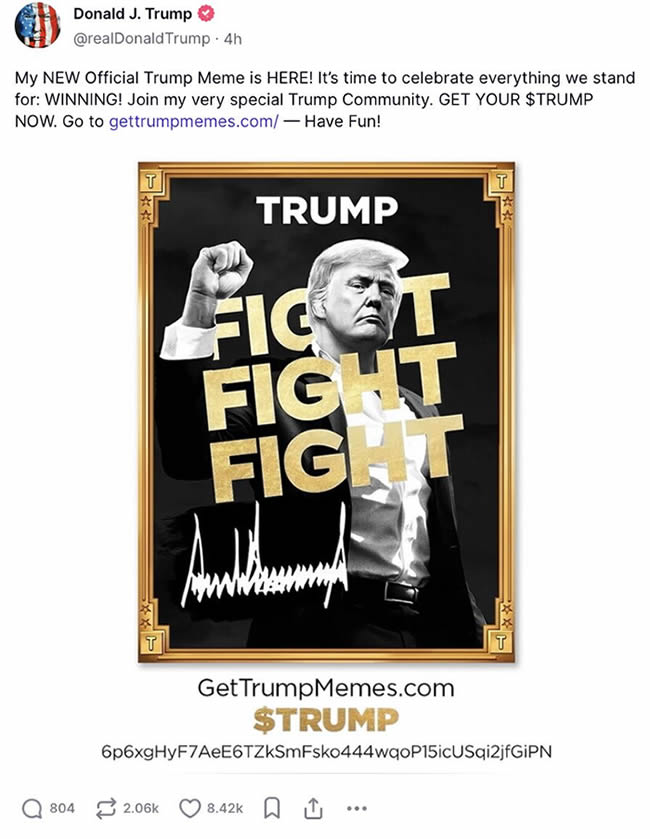 推文表示:“是时候庆祝我们的胜利了!加入我的‘特朗普社区(Trump Community)’。拿到你的TRUMP代币。玩得开心!”