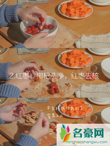 制作步骤1、木瓜削皮去瓤切块,红枣枸杞洗净,红枣去核