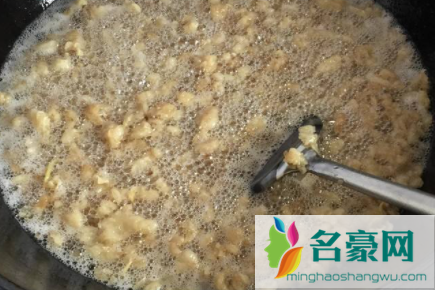 4、此时葱姜的香味已经炒熟了,再挑出白葱姜片。不然再炸下去会糊成糊状,猪油一沸腾就会变黑。
