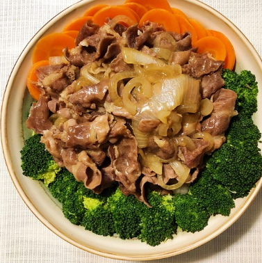 肥牛胡萝卜西兰花味醂淀粉清水生抽白糖盐羊葱耗油色拉油金牌肥牛饭的做法