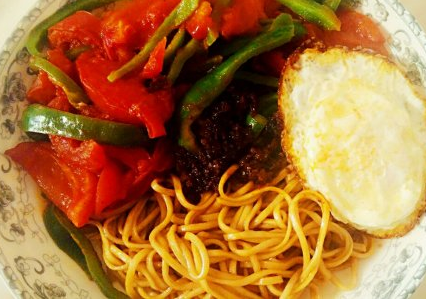 3、煮一锅水加盐,水滚后加入西红柿面条,以大火滚煮6分钟后,捞起拌橄榄油,静置2分钟后与酱汁拌匀盛盘,再以小西红柿、薄荷及少许干酪粉点缀即完成。