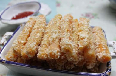 食材:地瓜2-3个、面粉适量、面包糠适量、鸡蛋1个