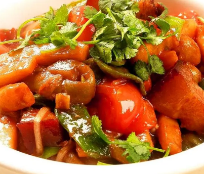 18. 粉皮变透明加入蒜苗段和香菜关火。