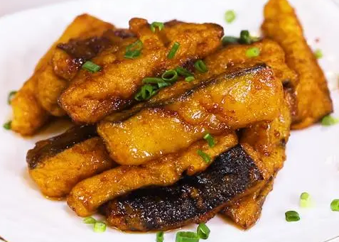(3)勺内放油,烧六七成热,把茄条挂全蛋糊逐条下入勺里,炸成金黄色,倒出沥油后装盘。