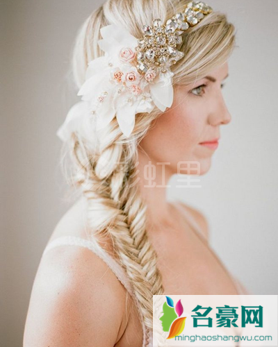 发型点评:欧美人的发色可为这款新娘发型增添了不少美感,使得整个发型看起更加的吸睛有魅力。那精致的鱼骨辫与你精美发饰的完美结合,可以使得造型变得更加的靓丽更加的吸人。如果新娘子们选择这一款造型的话,保证你美翻众人。
