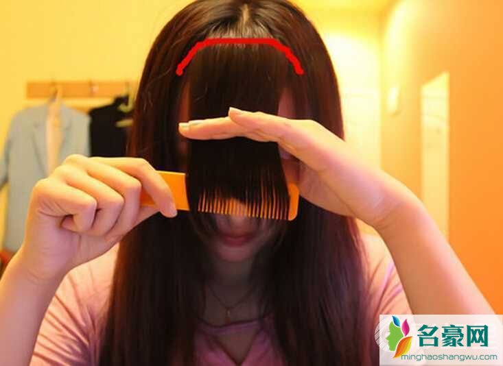 步骤三:分出的刘海分出三小部分,先从中间剪起,长度一定在眉毛以下。
