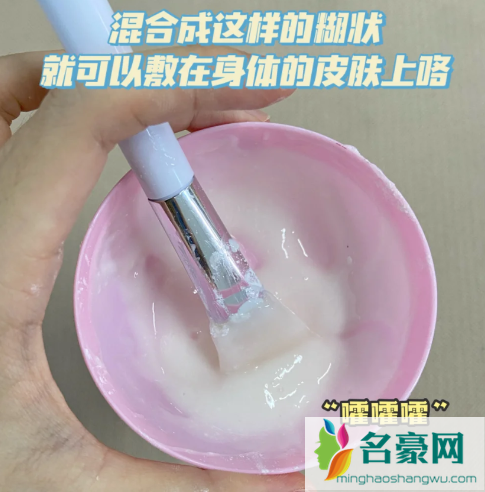 让珍珠粉和美白身体乳完全融合成没有颗粒感的糊状,就可以涂抹在身上的皮肤了,