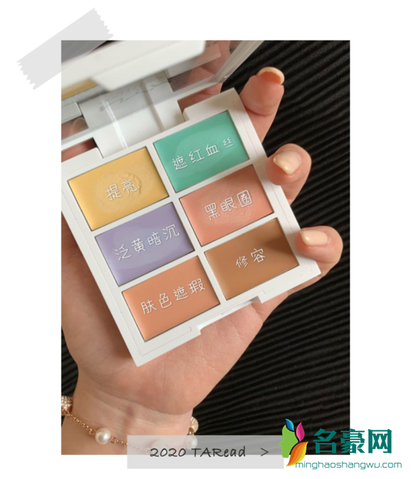 有4个修色润色和2个遮瑕提亮肤色,黄色遮黑眼圈眼袋,绿色修饰发红肌,紫色修饰肤色暗沉泛黄的皮肤,杏色可用作提亮肤色眼下,较为暗的两盘更适合拿来当做修容,当然看不出脏。