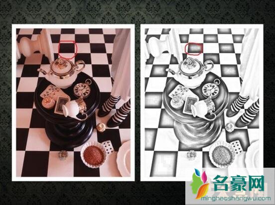 首先在图解开始前先看一幅图片,这是一副普通的图片,为什么选这幅图来做对比,因为图片中有较明显的黑白格子。从这幅图的PS后的黑白素描版看出,如果黑色格子的部分原本没有进行任何处理的话,那么黑白版的黑色格子是如图所见的那样,较为平滑。(图中红色线勾出的部分)