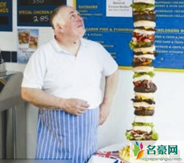 这个汉堡就是英国一对夫妇制作出的通天汉堡高达1.6米,因为原本没有人制做这个最高的汉堡,所以目前申请加入吉尼斯世界纪录。这种超级高的汉堡是由英国兰开夏郡的克拉克森夫妇制作的。这对夫妇花一个半小时,堆出高约1.6米、一层摞一层的通天汉堡,令人叹为观止。