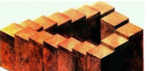 潘洛斯阶梯也是一种不可能图形,平常人用肉眼看是看出出来有任何的差别的,平面图片就是一个普通的照片,如果用三维的角度去观看的话,你就会发现潘洛斯阶梯的神奇之处了。从上图我们可以看到有四条向上的楼梯,并且都是相互延伸的,让你产生视觉上的错觉,看着就是想是一个无线循环的阶梯,让你永远也走不到终点。