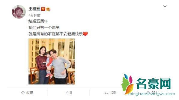 在2月14日情人节当天,王祖蓝在社交平台上更新了一条动态,王祖蓝晒出了一家三口的温馨合影,并且配文表示:“结婚五周年,我们只有一个愿望,就是所有的家庭都平安健康快乐”。