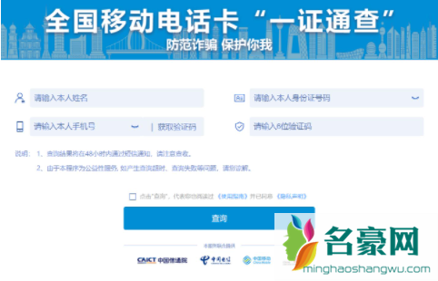 输入本人姓名、身份证号、手机号和6位验证码信息,即可查询。国内所有移动电话号码都可以查询,查询结果将在48小时内通过10699000 统一短信端口回复通知。此业务为公益性服务,不受任何资费。